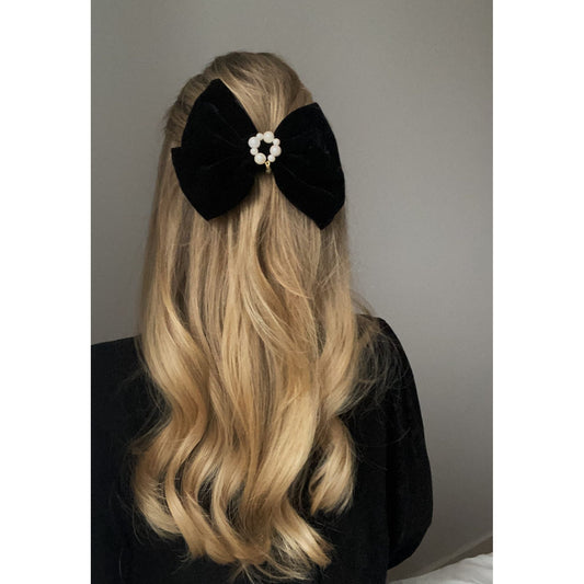 Hárspenna svört flauels slaufa með perlum